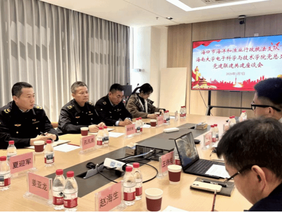 1月7日下午,海口市海洋和渔业行政执法支队、pg游戏电子模拟器党总支党建联建共建座谈会在信息科技大楼507会议室举行。市海洋和渔业行政执法支队党总支书记、政委蔡於海;pg游戏电子模拟器党总支书记林华出席会议。座谈会由林华主持。双方围绕海洋渔业执法智能化升级、禁渔期监管技术合作等展开交流,探索“党建+业务”融合新路径。