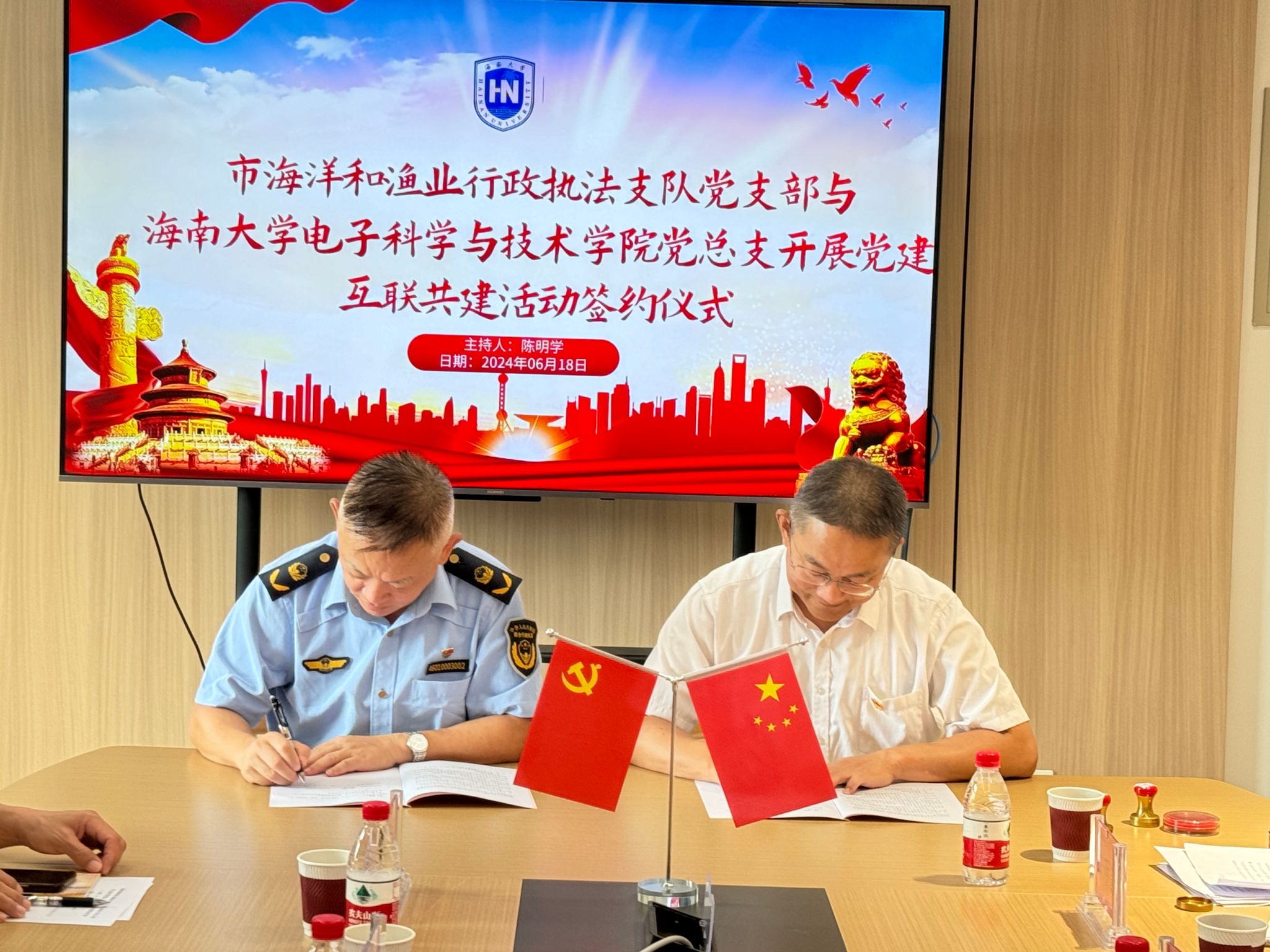 6月18日上午,海口市综合行政执法局海洋和渔业行政执法支队党支部与pg游戏电子模拟器党总支党建互联共建签约仪式在pg游戏电子模拟器信息科技大楼507会议室举行,市海洋和渔业行政执法支队党支部书记、政委陈明学;pg游戏电子模拟器党总支书记林华出席会议,会议由陈明学主持。